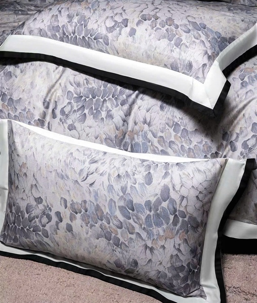 Phối hợp viền hoa gấm vàng ánh, kết hợp kỹ thuật ghép vải và chế tác tinh xảo, cả bộ chăn ga tựa như một tác phẩm nghệ thuật được đặt trong phòng ngủ, nâng tầm vị thế và gu thẩm mỹ.